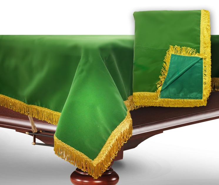 Данный чехол предназначен для бильярдного стола размером в двенадцать футов, у него зелёный цвет. Сделано покрывало из такого материала, как мягкий и плотный бархат, он очень износостойкий и долговечный. У данного чехла нет резинок по краям, тем не менее, он отлично держится на столе и не слезает с него. Особый уход за таким покрывалом не требуется, его эксплуатация максимально легкая и простая. Материал покрывала плотный, поэтому оно не пропустит влагу к столу.
